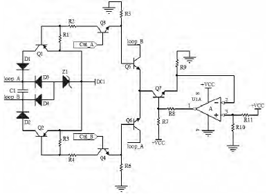 圖2為勵磁方波產(chǎn)生電路。Ctrl_A、Ctrl_B為相差半周期的方波控制信號,當Ctrl_A為高電平時,三基管Q3工作在放大區(qū),Ctrl_B端信號為低電平,三基管Q4、Q6截止,Q1用作開關(guān)管,工作在飽和區(qū),loop_A端輸出電壓為高電平;Q2工作在截止區(qū),loop_B端電壓低,驅(qū)動線圈工作;在Ctrl_A端信號的負半周期,分析情況同上,這樣,就得到了低頻矩形方波。U1A和Q7及電阻構(gòu)成了恒流源,+VCC為Q7提供基基偏置電壓,R9上流過的電流大小是恒定的。這樣,Ctrl_A、Ctrl_B端方波相差半周期使得上下兩部分的對稱電路交替導通,并且產(chǎn)生穩(wěn)定的勵磁電流,驅(qū)動線圈工作,達到恒流勵磁的目的。DC1提供高電壓,反向串聯(lián)穩(wěn)壓管Z1,輸出穩(wěn)定電壓,保證磁基輸出方波勵磁信號時低電壓不至過低。