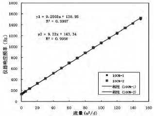 在大慶油田進行了模擬井實驗,對電磁流量計系統(tǒng)進行了動態(tài)測試,結(jié)果如圖4所示。其中橫軸表示測量系統(tǒng)中流體通過的體積流速,用流體體積與天數(shù)之比表示,單位是m3/d;縱軸表示儀表響應(yīng)頻率的值,單位是Hz。