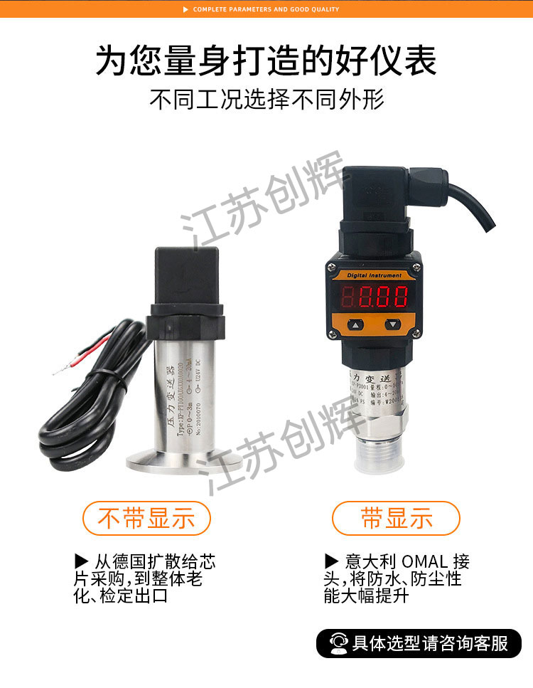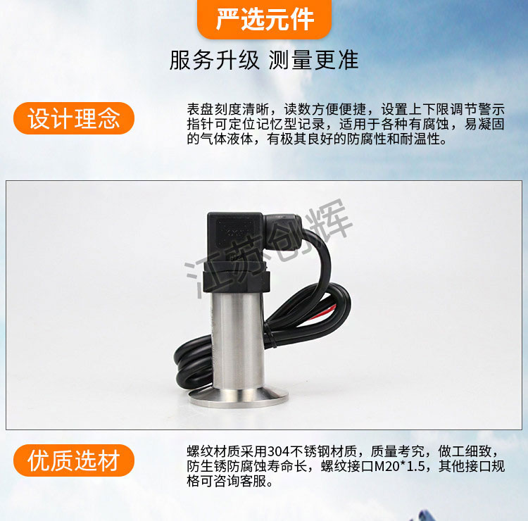 CH-2088W衛(wèi)生隔膜壓力變送器是專門為醫(yī)藥、啤酒、奶倉(cāng)等醫(yī)藥食品領(lǐng)域設(shè)計(jì)的專用型產(chǎn)品,該系列采用E+H**技術(shù),其設(shè)計(jì)完全遵照醫(yī)藥食品行業(yè)的衛(wèi)生級(jí)標(biāo)準(zhǔn)。利用齊平大波紋片使測(cè)量介質(zhì)與壓力傳感器相隔離,其間灌充衛(wèi)生及專用油,可保證在介質(zhì)溫度150℃的高溫下無溫漂的穩(wěn)定工作。客服了目前工業(yè)現(xiàn)場(chǎng)上常用齊平式擴(kuò)散硅或陶瓷電容變送器因傳感器直接接觸介質(zhì),從而在高溫情況下溫漂大,導(dǎo)致超差,尤尤其是滅菌環(huán)境節(jié)時(shí)變送器極容易損壞的弊病。